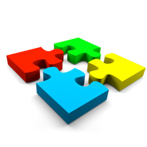four color puzzle pieces combined cooperation concept on white background