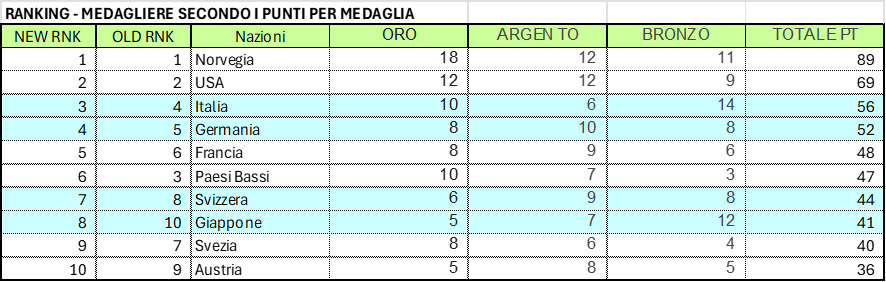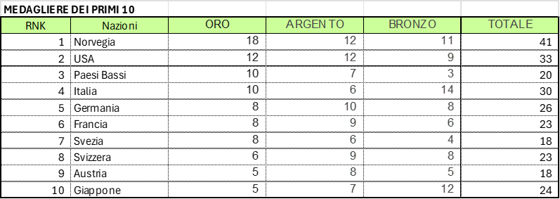Prendendo da GOOGLE i primi dieci classificati alle Olimpiadi di Milano-Cortina 2026 abbiamo la seguente situazione: