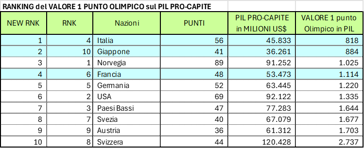 Desidero ora rapportare i Punti Olimpici al PIL nominale pro-capite e quindi esporre l’ordinamento secondo i valori decrescenti: