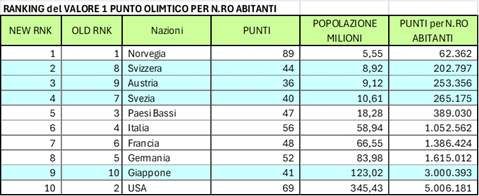 Questo è un metodo di rappresentare la situazione, ma mi corre l’obbligo di fare una osservazione: chi ha vinto un solo oro vale di più di chi, pur non avendo ori, ha vinto dieci bronzi? Mi sentirei di negarlo. Allora provo ad attribuire un peso ponderale a ciascuna medaglia: tre punti all’Oro, due punti all’Argento ed un punto al Bronzo. Sviluppando il calcolo otteniamo un risultato che chiamerò “Punti Olimpici”. Creo quindi un ordinamento secondo il decrescere dei Punti Olimpici:
